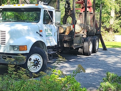 Our full size log loader truck sets us apart from many other small tree companies; while someone else is spending hours cutting up logs and hauling them away, we will already have the job done.